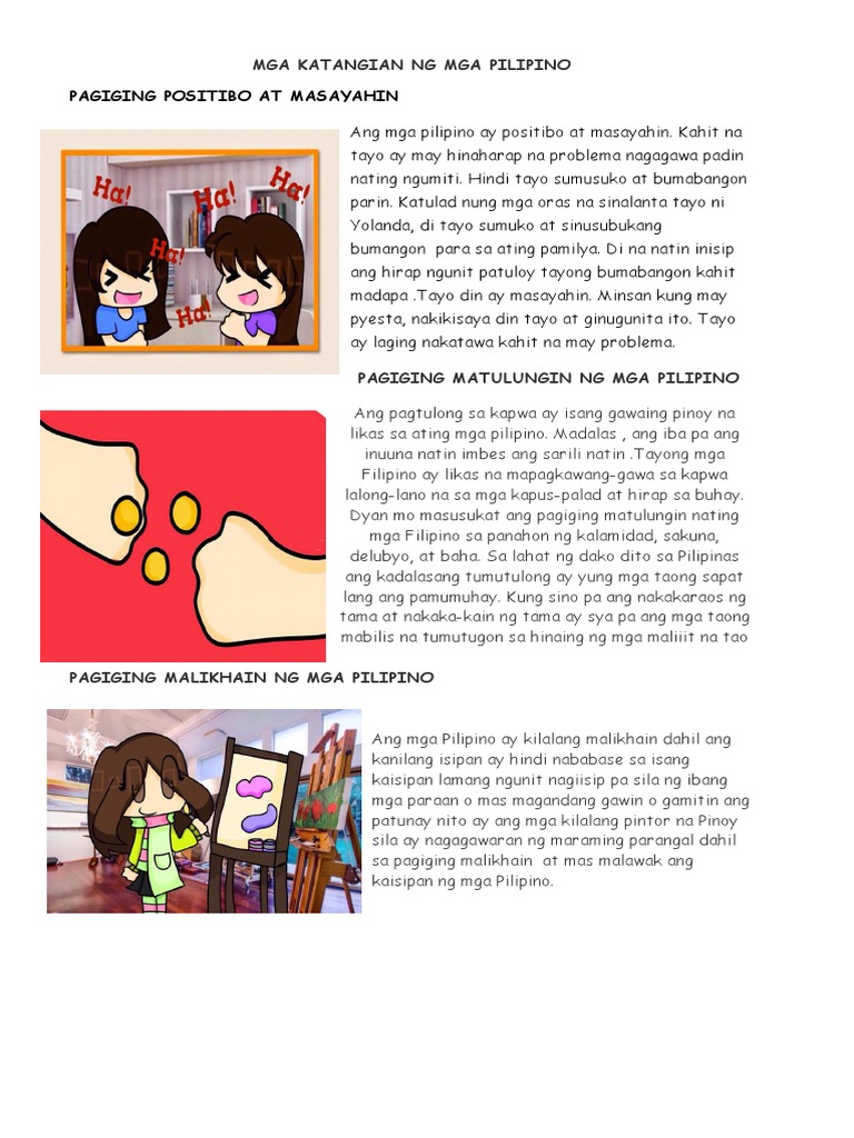 MGA POSITIBONG KATANGIAN NG PILIPINO ni. Ito ay naka-link sa parehong pagmamataas at kayabangan. Mga Katangian Ng Batang Pilipino.