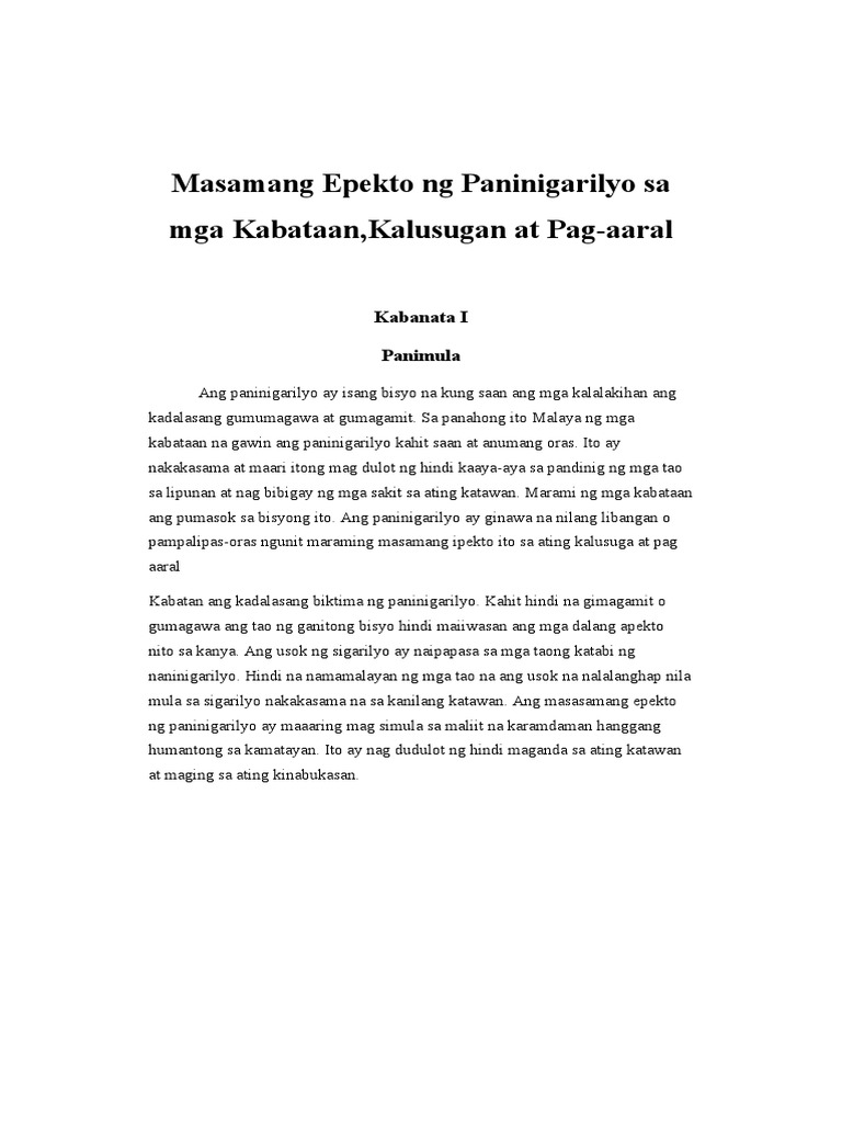 Naparakaraming klase ng kanser ang pwedeng makuha mula sa paninigarilyo mula sa bibig lalamunan baga pancreas at cancer. Pages 15 This preview shows page 2 -. PANIMULA Ang paninigarilyo ay isa sa mga kinahuhumalingan ng matatanda lalo na sa mga kabataan ngayon.