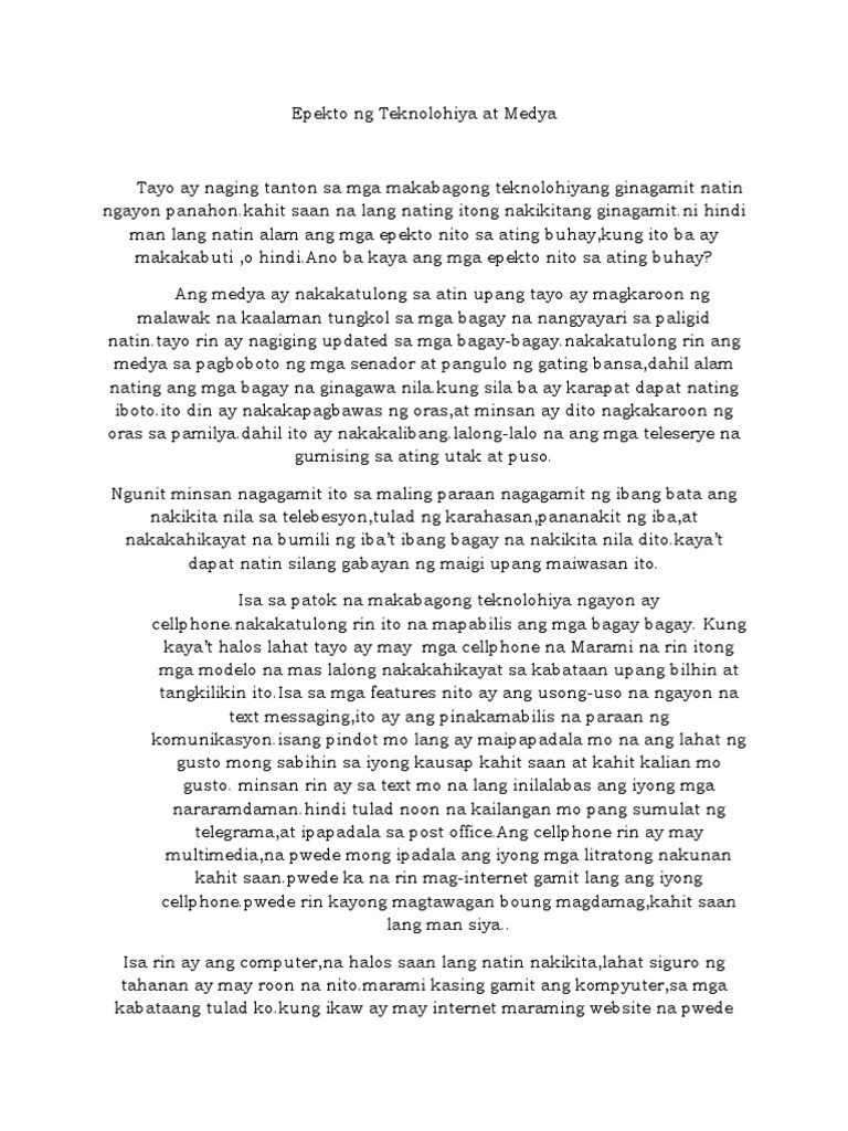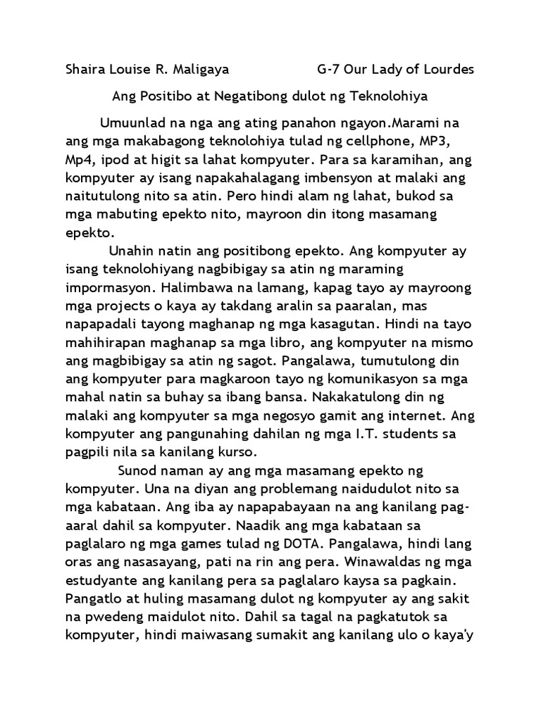 1 See answer fjaja05 fjaja05 Ang paglago ng teknolohiya na may mabuting dulot sa atin tulad na lamang ng gadgets. The essay was a popular form of expression for the early writers. Ang teknolohiya ay ang pagsulong at paglapat ng mga kasangkapan makina kagamitan at proseso upang tumulong sa paglunas ng mga suliranin ng tao.