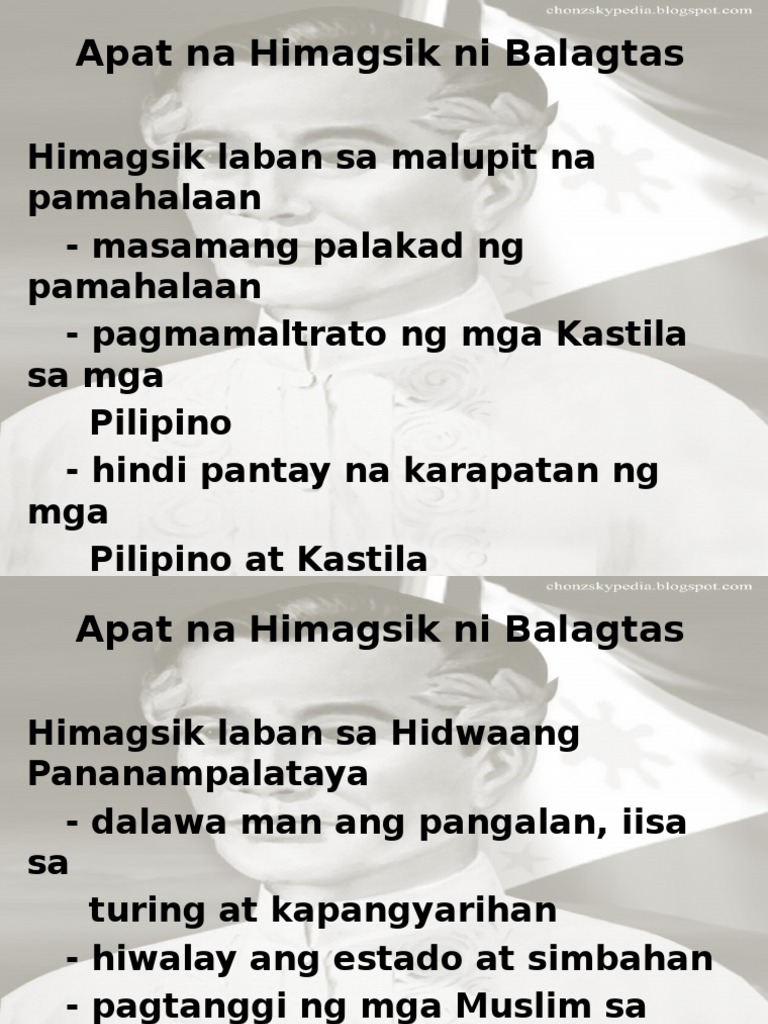 Ibinaba mula sa ulap ang awit sinuyod sinala at marahas na pinagpag at nakakipil ng isang bagong katuturan. 1Himagsik Laban sa Masamang Pamahalaan Pamahalaang Kastila Sa loob at labas ng bayan kong sawi kaliluhay siyang nangyayaring hari kagalingat bait ay nalulugami Ininis sa hukay ng dusat pighati 2Himagsik Laban Maling Pananampalataya Ipinahahayag ng pananamit mo taga-Albanya ka at akoy Persyano ikaw ay kaaway ng bayat sekta ko sa lagay mo ngayoy. Isa sa mga himagsik na ipinaghiwatig ni Francisco Balagtas sa paggawa niya ng kanyang bantog na akdang Florante at Laura ay ang unang himgasik.